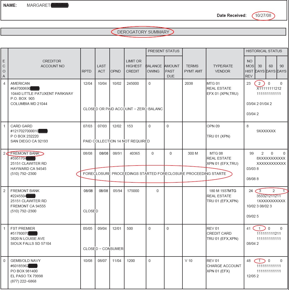 Slide 1 is a initial credit report with a Foreclosure, multiple lates and a low initial score. Slide 2 ( after 90 days ) shows Foreclosure Removed and Lates removed on GEMB, Old Navy, First Premier and Fremont Banks and a score increase of 89 points.